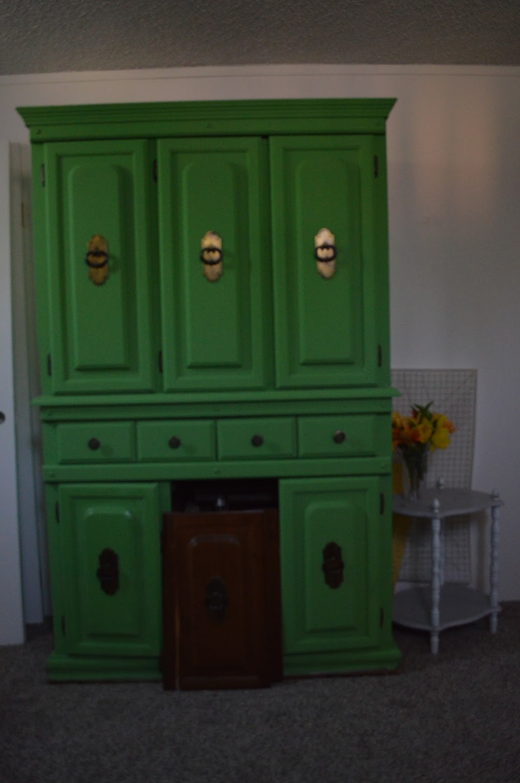 My mom so graciously gave me her old sewing cabinet that she had bought 20 years ago! I have been begging for this for forever but didn't have a home for this. My mom was ready to get rid of it, as she hasn't done a whole lot of sewing, and as soon as we closed on this house my mom brought it up! We unfortunately broke the bottom door off of it on accident and havent repaired it yet but I painted it in Anne Sloan Chalk Paint and LOVE the bright green! This room also doubles as our guest room when we have my parents come and stay, its not fancy but an air mattress is easily rolled out and it does the job okay:)